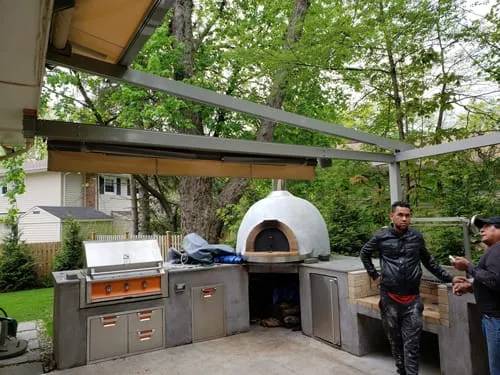 Most people are familiar with retractable awnings, but retractable canopies are a little less common. This project, installed in Chatham NJ, is an example of a beautiful Alutex Solaria Retractable Canopy. It adds solid structure to the home, while enabling sun and heat relief, and a beautiful outdoor patio space. Obviously, the family is into cooking — we want to be invited back for some brick oven pizza!