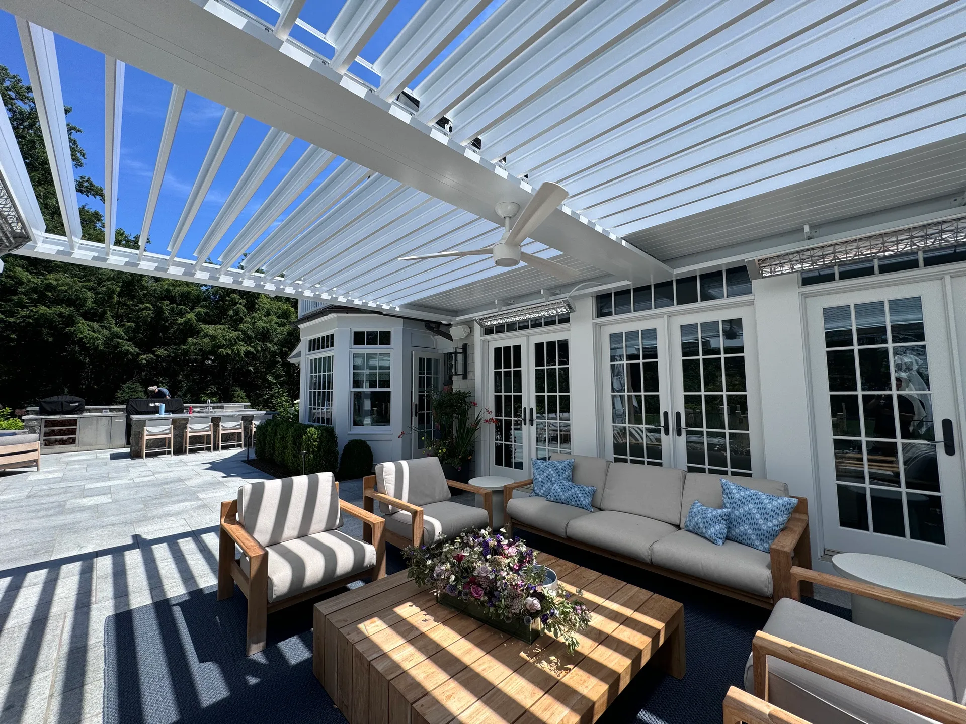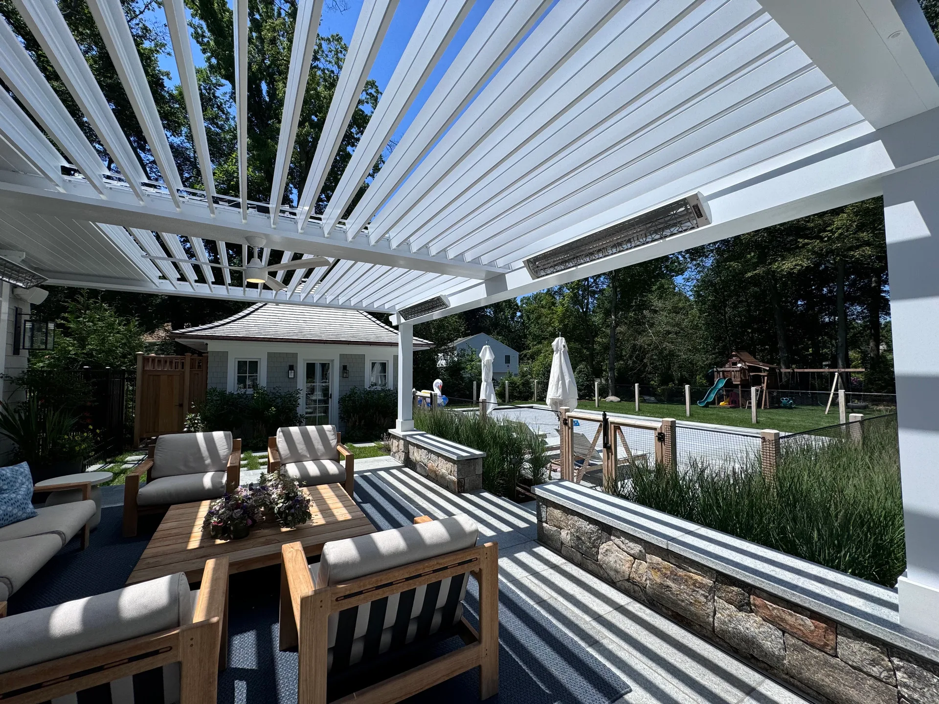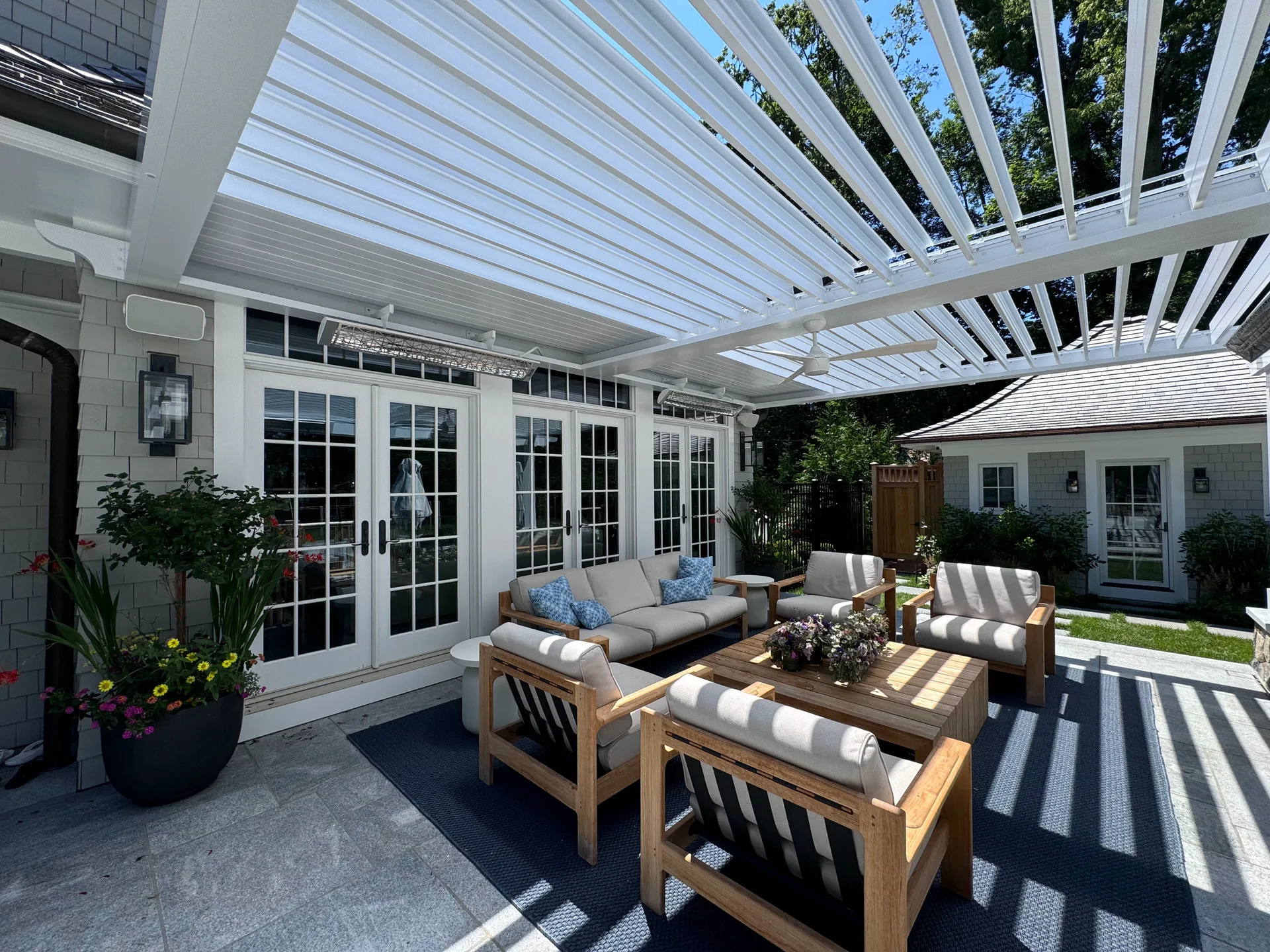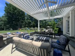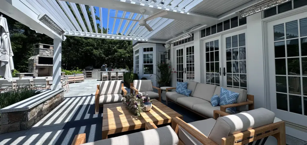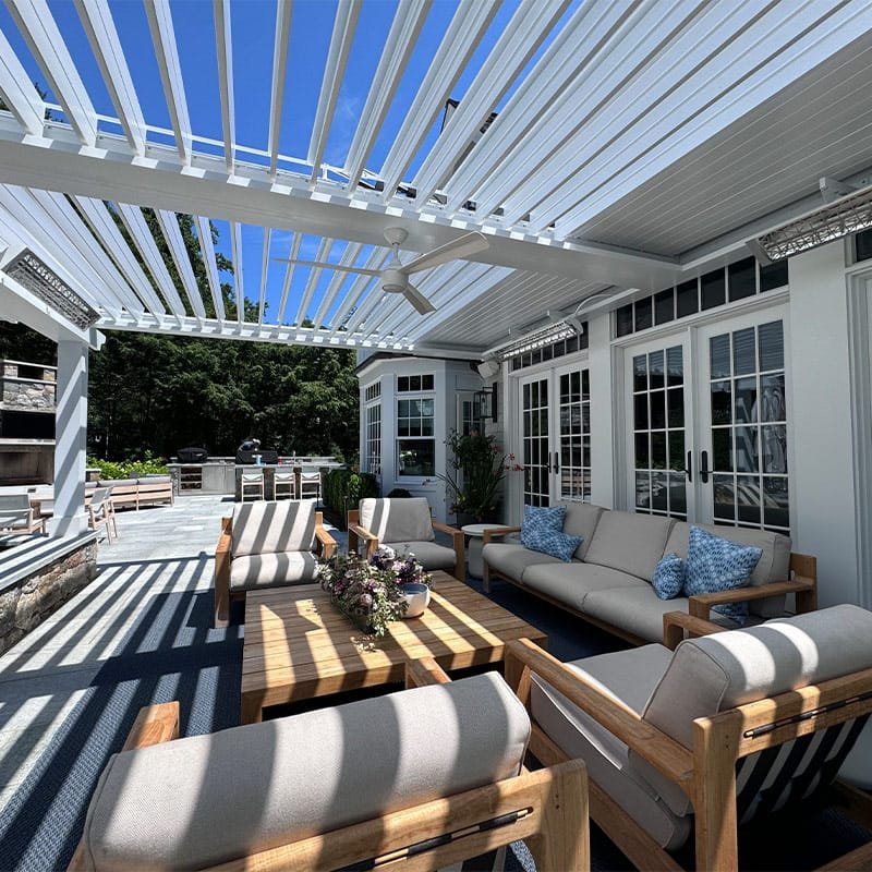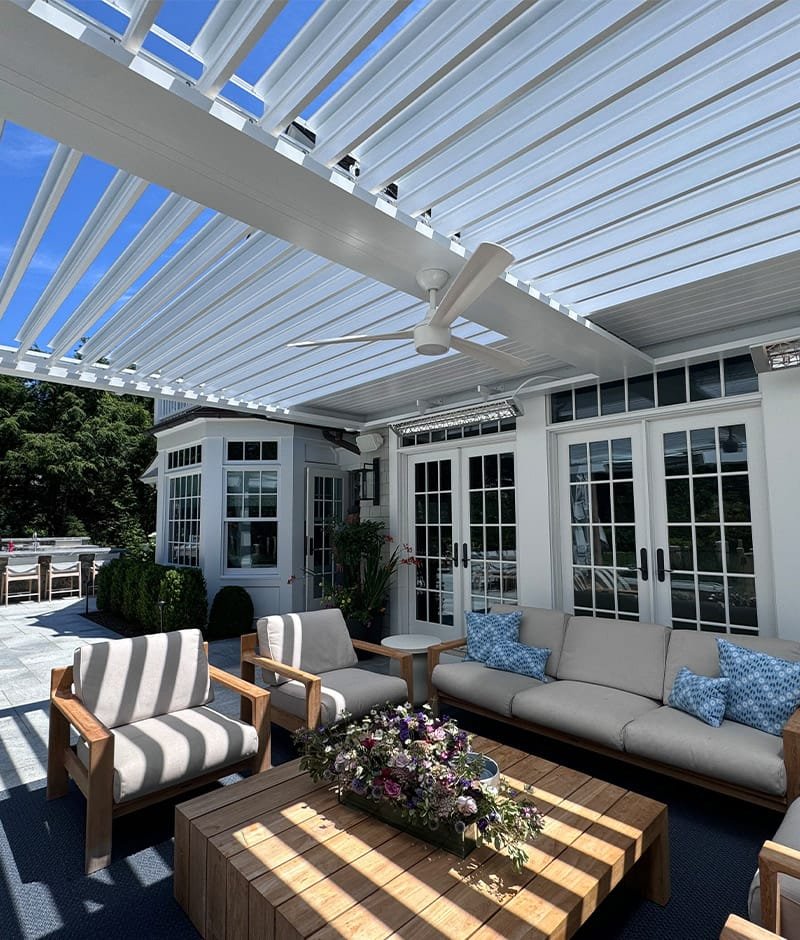 We installed a classic style louvered roof system in riverside Connecticut that added the perfect charm to the client’s home and complemented the house perfectly. The client also installed bromic 6000-watt heaters for them to enjoy in the colder months. They love the rain protection and shade control the system provides and the expertise in the craftsmanship we provide.
