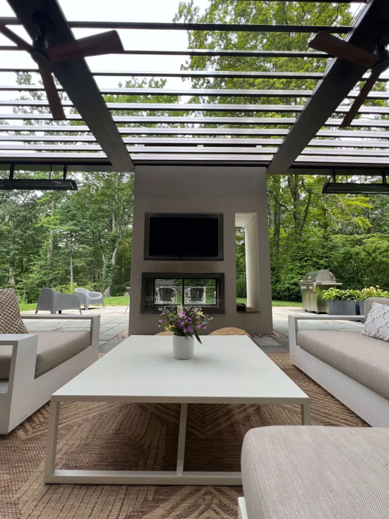 Using our expertise in the industry, we installed a beautiful louvered roof system in New Canaan, Connecticut. Not only did we transform the space with a premium louvered roof system, but we also integrated a built-in fireplace T.V. wall.