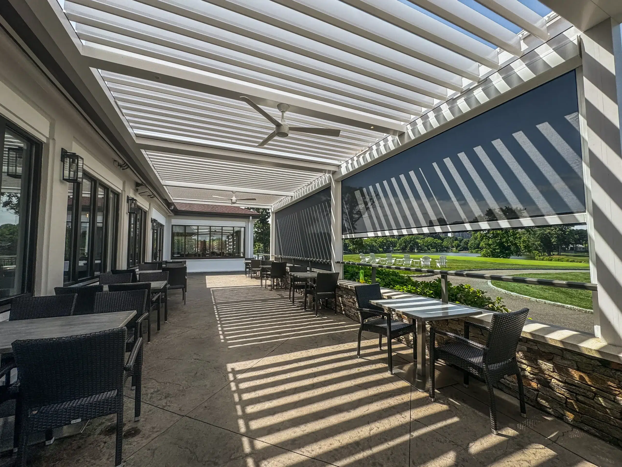 This project transformed the club’s patio into a high-end, climate-controlled outdoor destination that members love year-round. With two sleek louvered roof systems and motorized shades, Lake Success Country Club now has an inviting, adaptable space ideal for dining, social events, and private functions in any season.