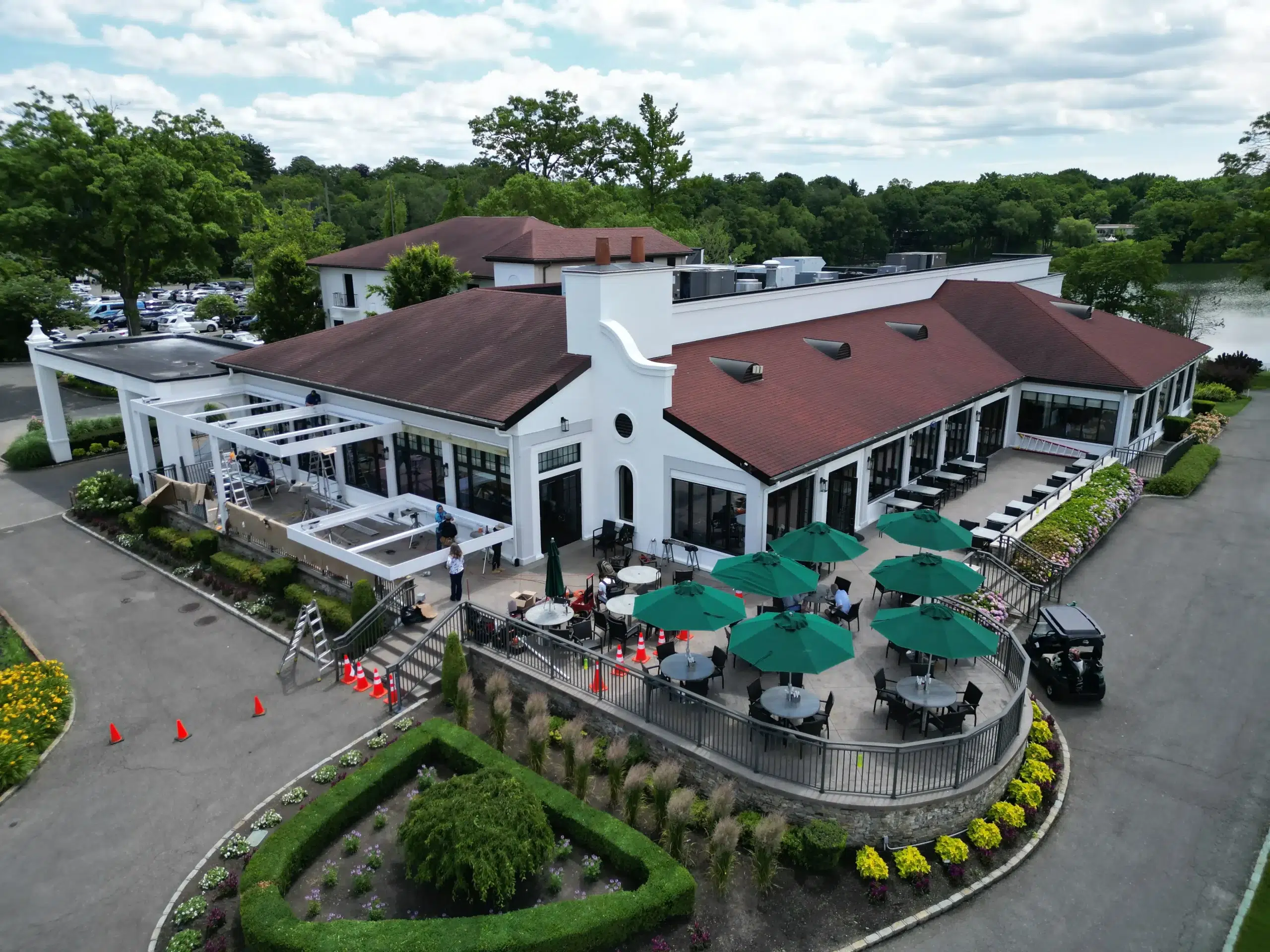 At Lake Success Country Club, we engineered and installed two modern, all-white motorized louvered roof systems designed to elevate the club’s outdoor dining and event experience. The goal was to transform their existing patio space into a luxury, all-weather environment that could serve guests year-round — and the result exceeded expectations.