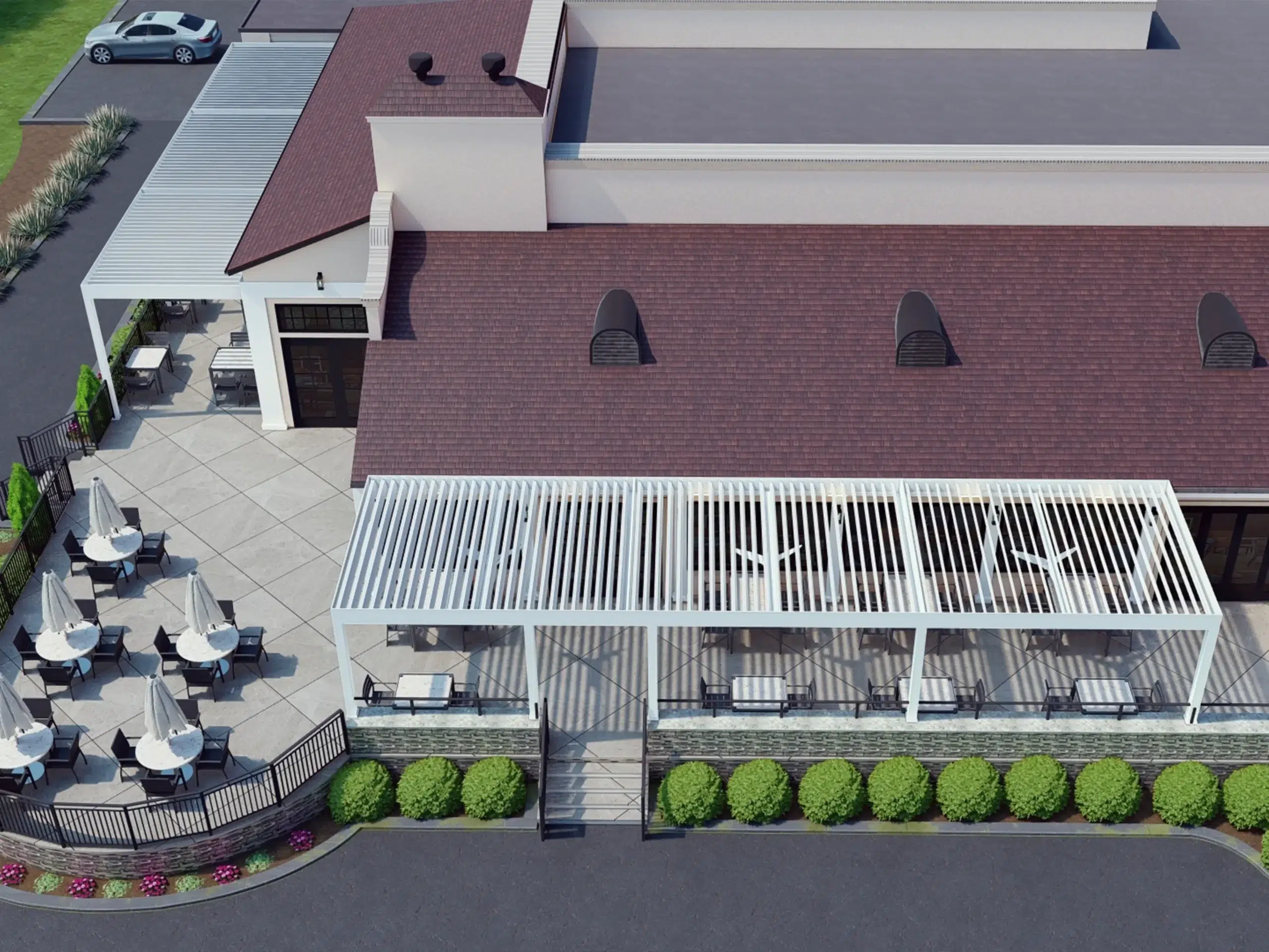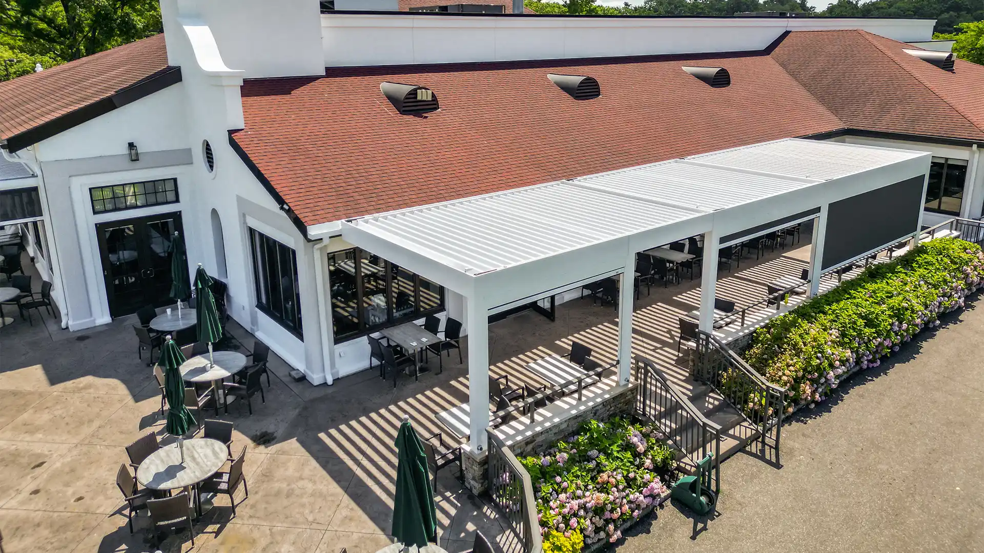 Motorized rotating louvers for customizable sun, shade, and ventilation Integrated gutter and drainage systems for heavy rain protection Motorized drop-down shades to block wind and add privacy This gives the club complete control over the outdoor environment at all times.