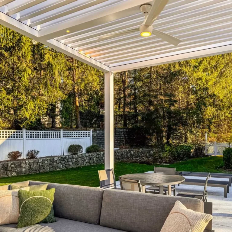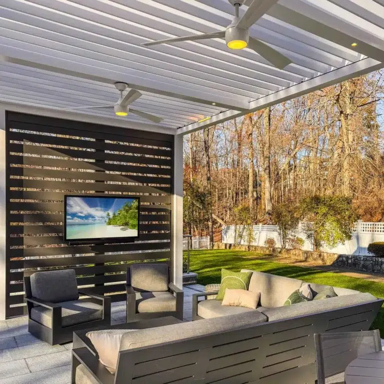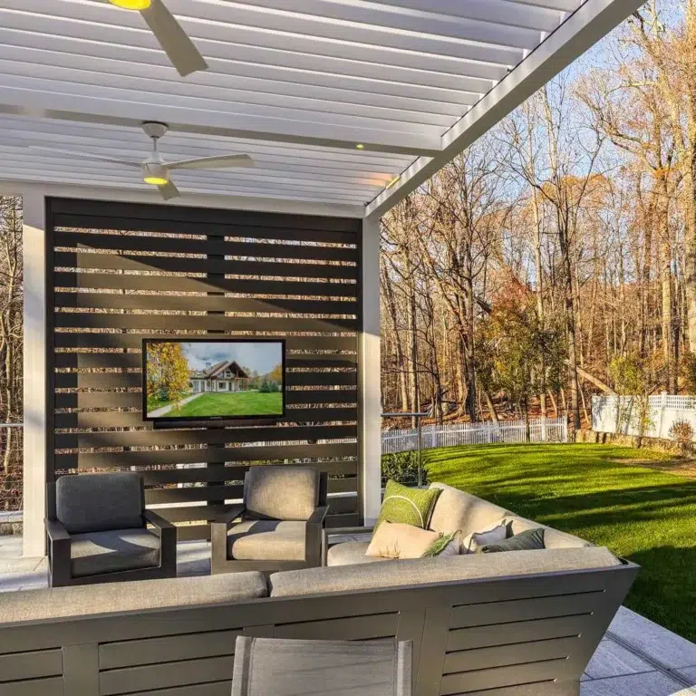 Objectives and features: They wanted a poolside motorized pergola with a built-in privacy wall and T.V. wall mount.