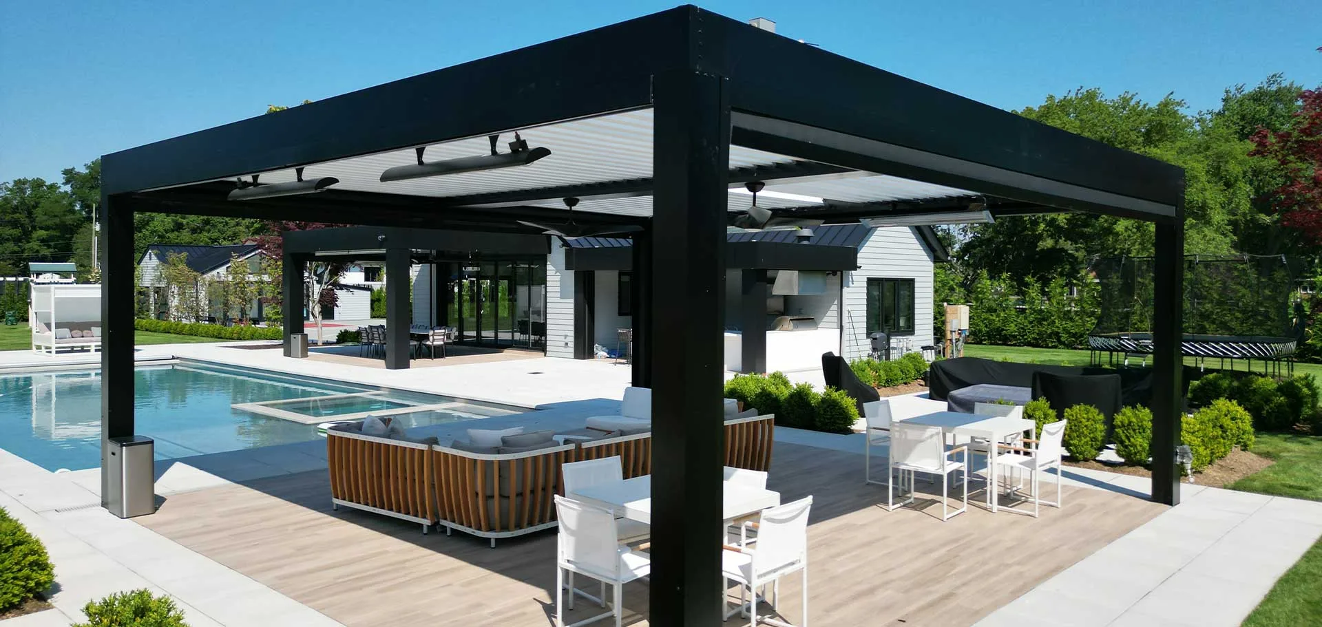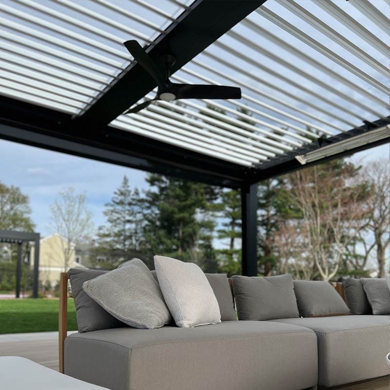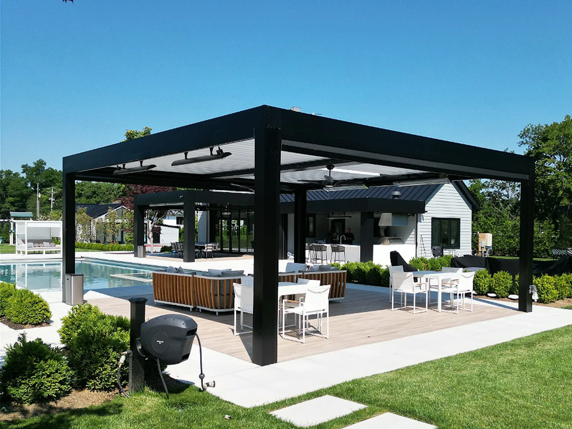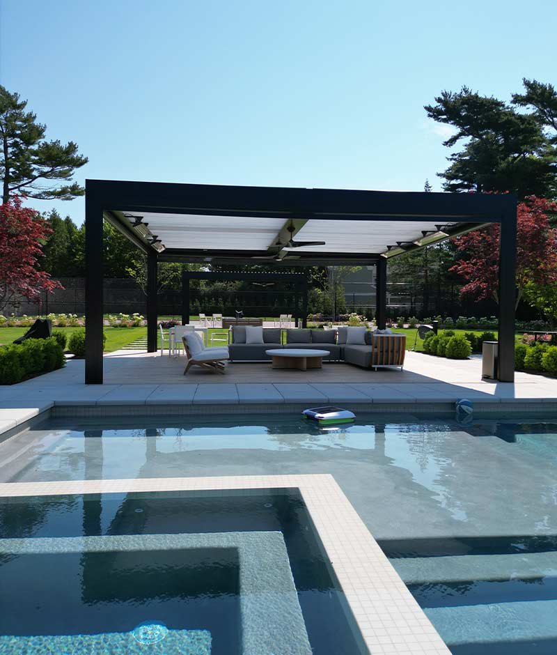 The client desired a functional two-pergola solution that would match the modern aesthetics of the home. The modern style louvered roof system was the perfect solution because of the sleek and contemporary look it provides, and the opening and closing roof provides the functionality he desired. Hosting BBQs and gatherings by the pool were now elevated to new heights. his outdoor experience was now luxurious and stylish.