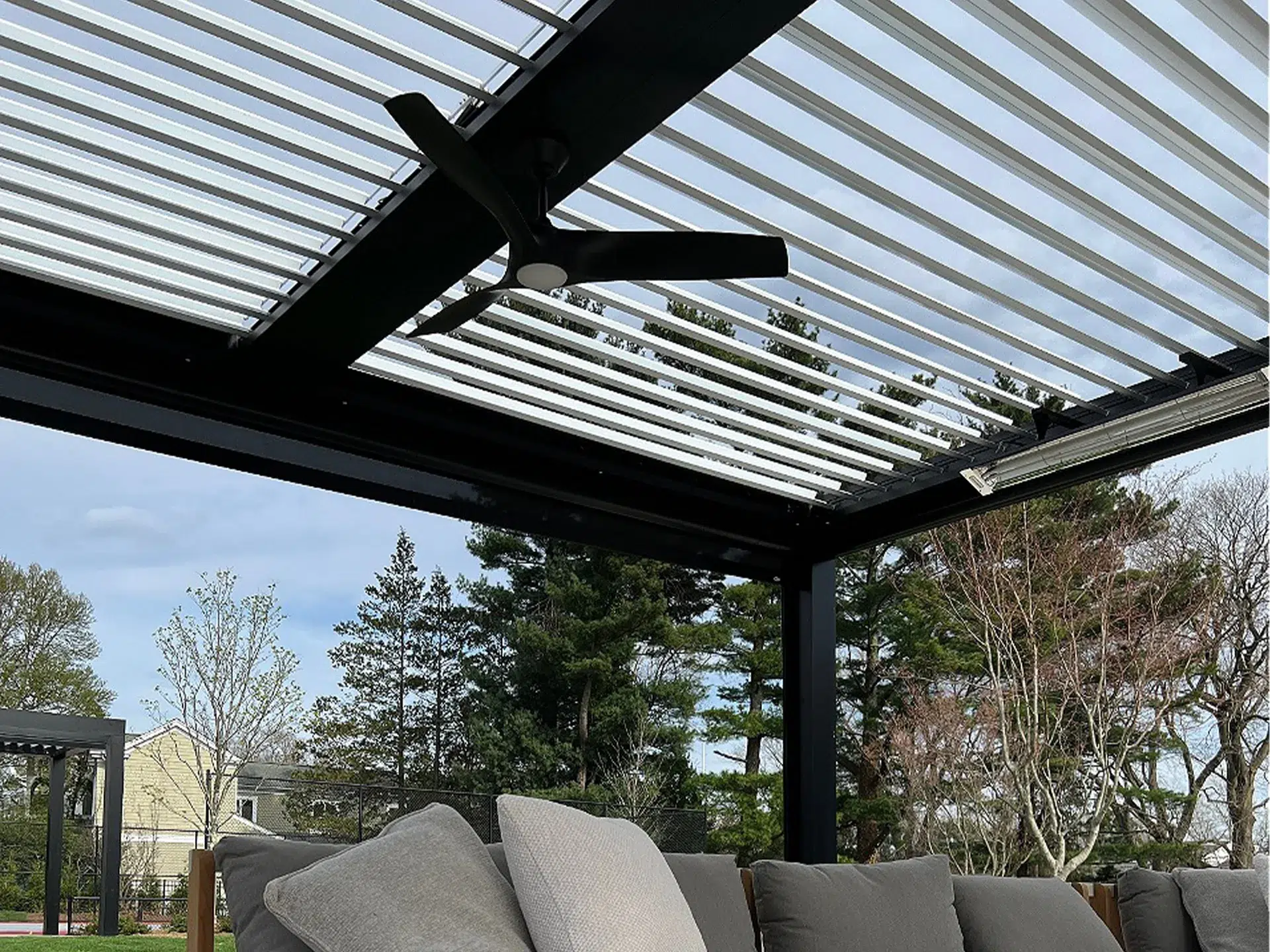 The client had a vast and open yard with little to no shade. The client loves this space to enjoy in the summer and wanted to upgrade the outdoor space. That’s where we came in and installed two modern-style louvered roof systems that completely elevated the outdoor space!